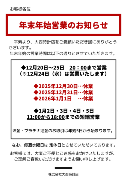 ※金・プラチナ地金のお取引は年始5日から始まります。