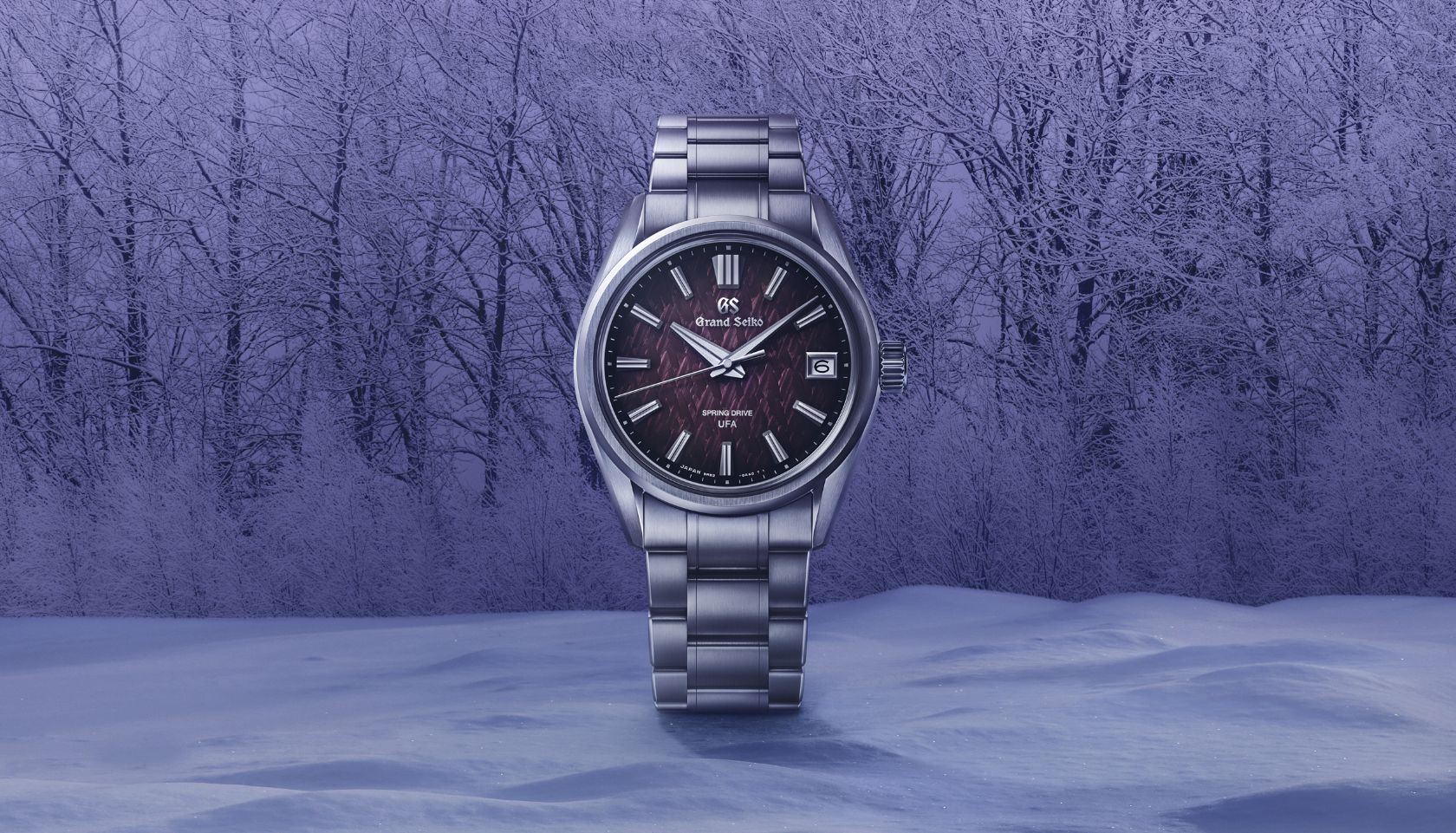 グランドセイコーの真髄と日本の美意識を高い次元で融合させた独自のデザイン文法「エボリューション9スタイル」をベースにした、スプリングドライブU.F.A.の限定モデルです。ダイヤルには、スプリングドライブの製造地である信州地方の樹氷の森が静かに目覚める夜明けの神秘的な情景を、精緻な型打模様とバイオレットカラーの繊細なグラデーションで表現しました。