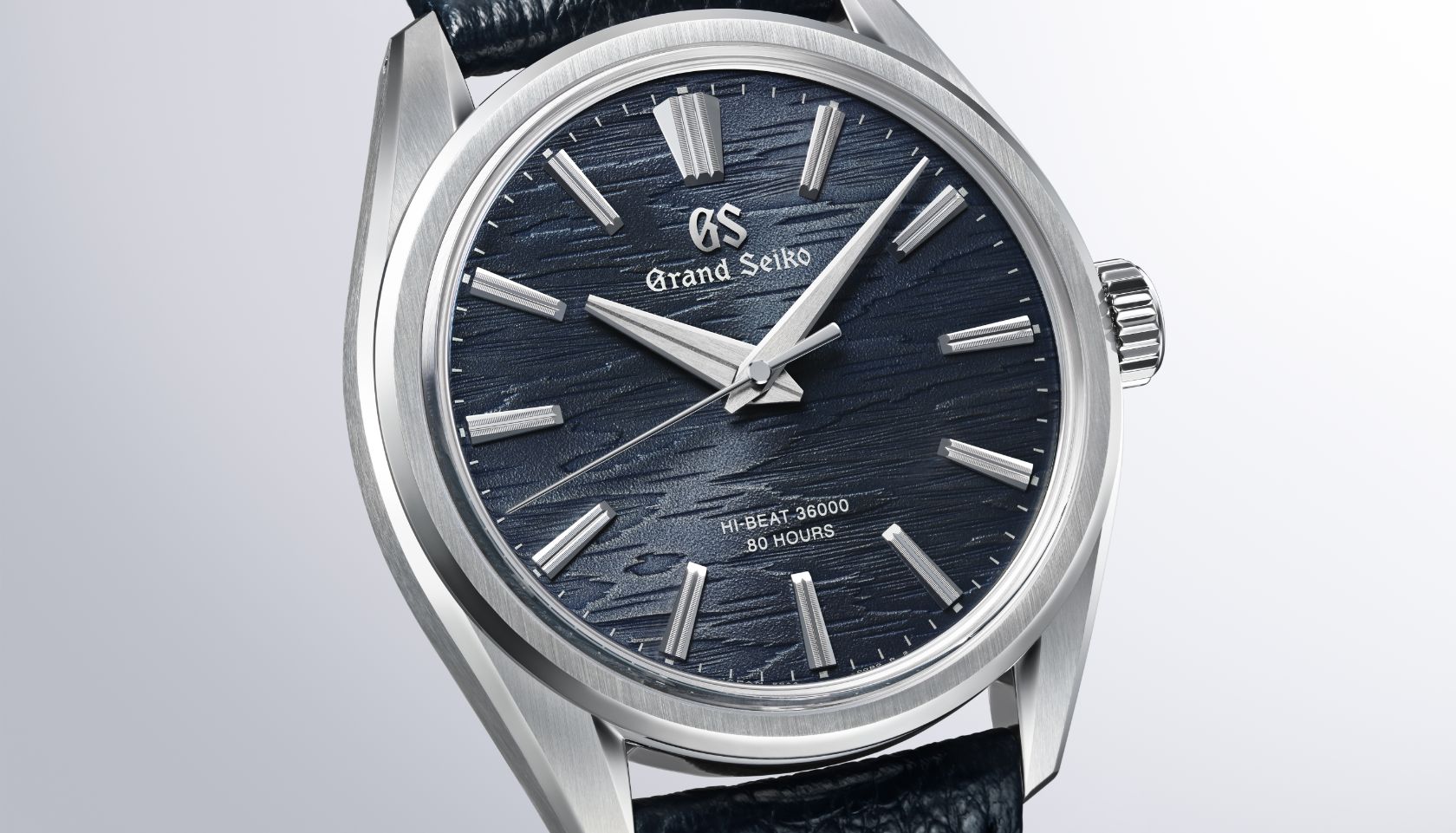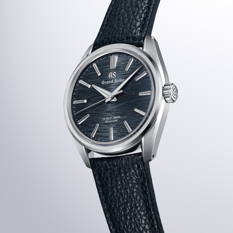 ネイビーカラーのダイヤルは、月あかりに照らされた白樺の樹皮をイメージしました。ステンレススチール製のケースは厚さ9.95mmと薄型に仕上げ、すっきりとしたインデックスやベゼル、ラグの幅が、グランドセイコーのドレスウオッチにふさわしい繊細で優美なる存在感を演出しています。